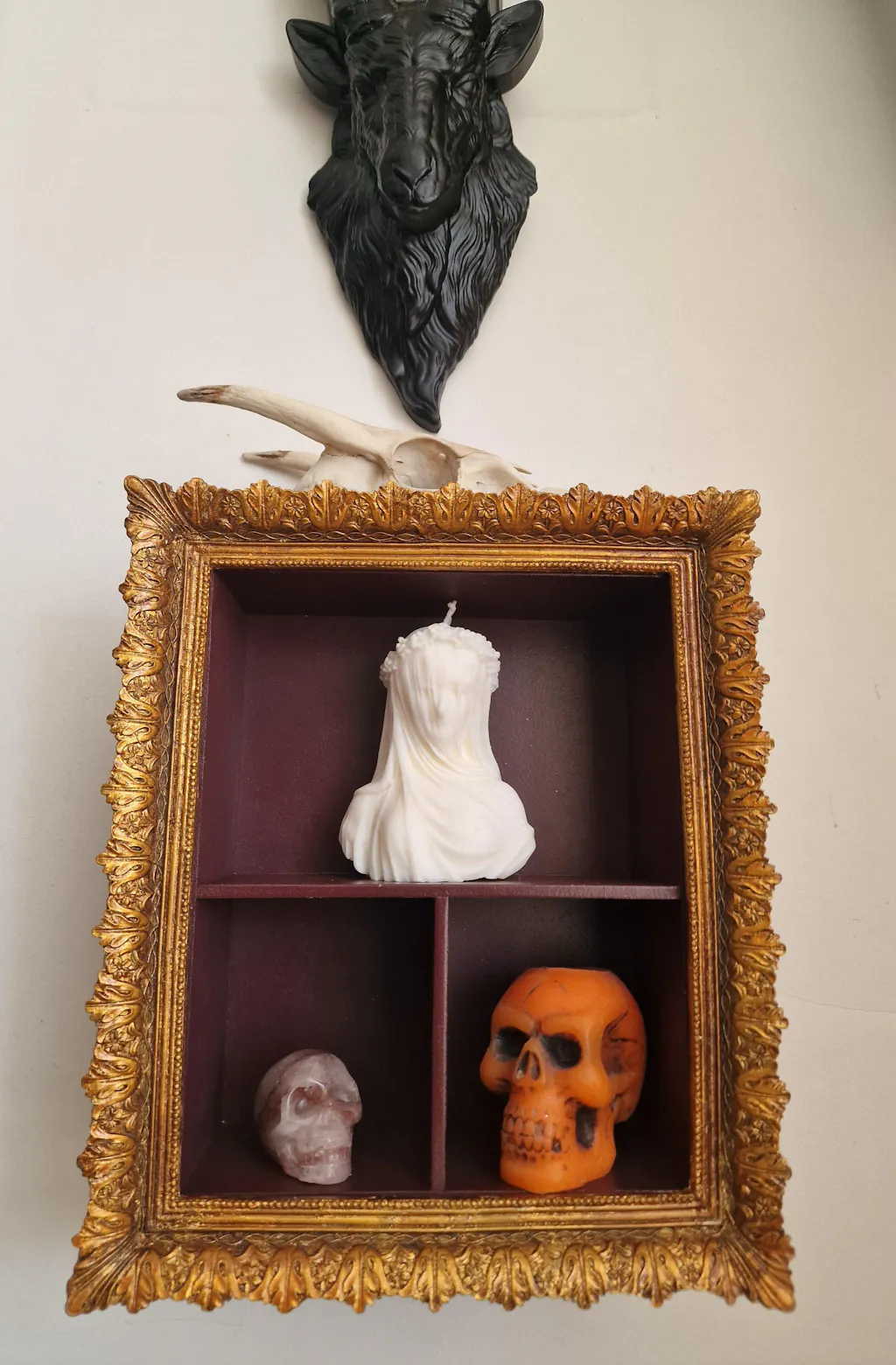 The ornate baroque shelf that is designed for all of the things small things we never quite know where to place. The interior is painted in a deep ox-blood red to perfectly showcase the trinkets that are placed inside.