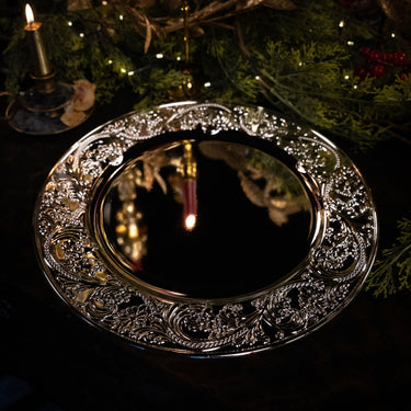 Elevate the dark Christmas table with the Victoriana Style Banquet Plate in Silver. Intricate patterned edges of the banquet plate frame your dinner plates beautifully! Simply place your own dinner plates on top of the banquet plate to frame your dinner creation!