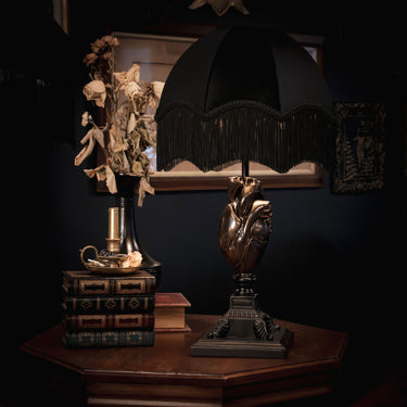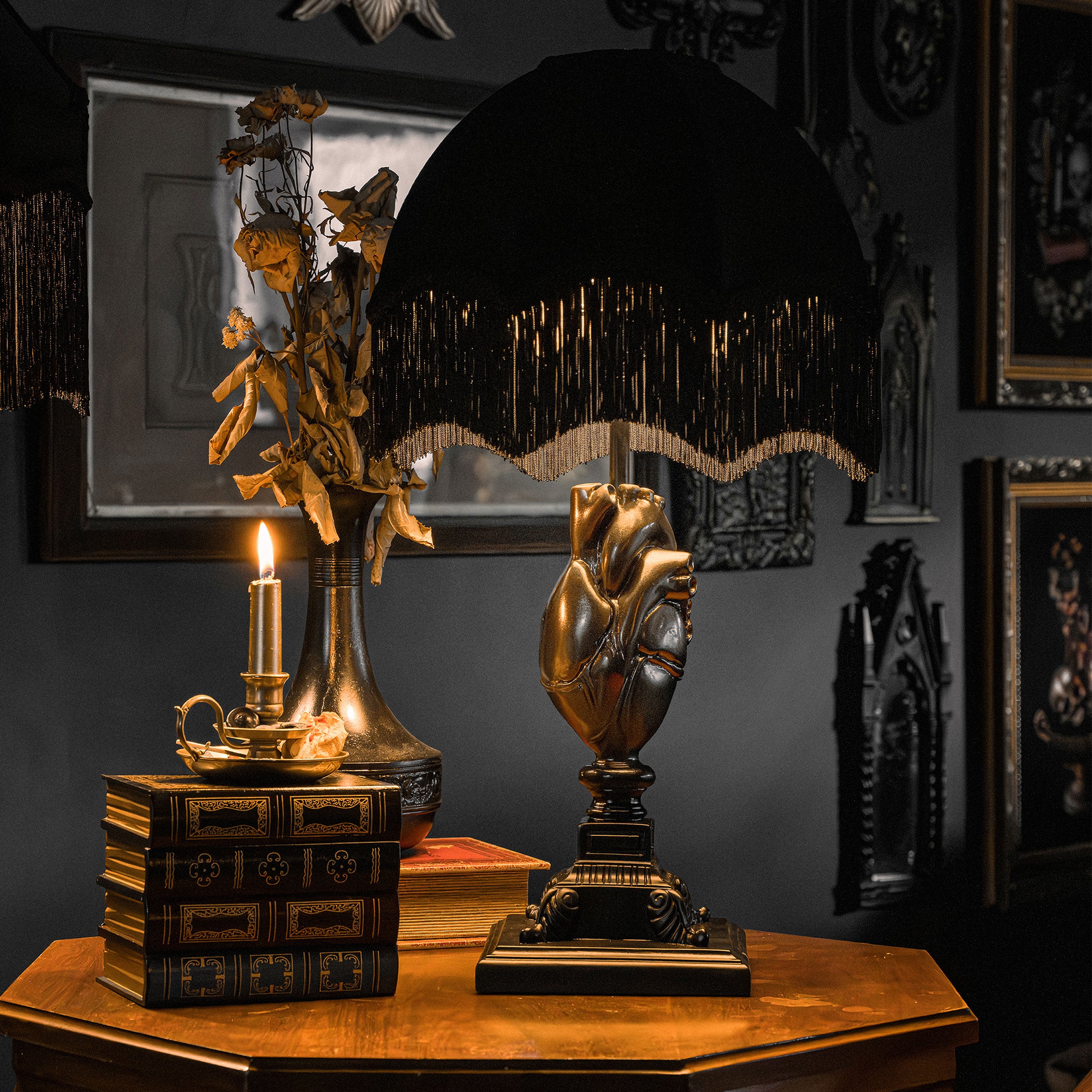 - Baroque Lampshade option is our iconic Gothic Baroque Black Velvet lampshade. Made from Black velvet fabric, with a 4 inch jet black fringe. The lampshade is lined with a pale gold fabric inner for a subtle warm glow on your heart lamp.