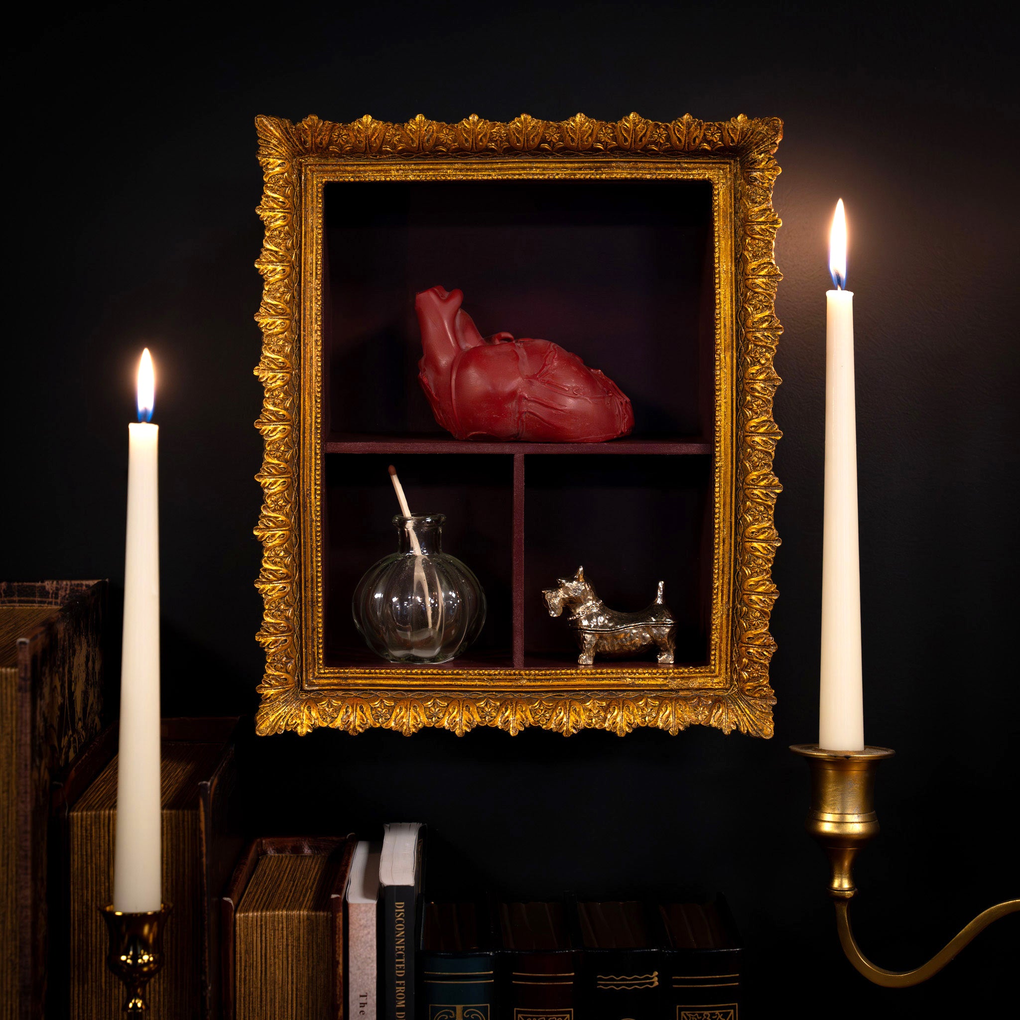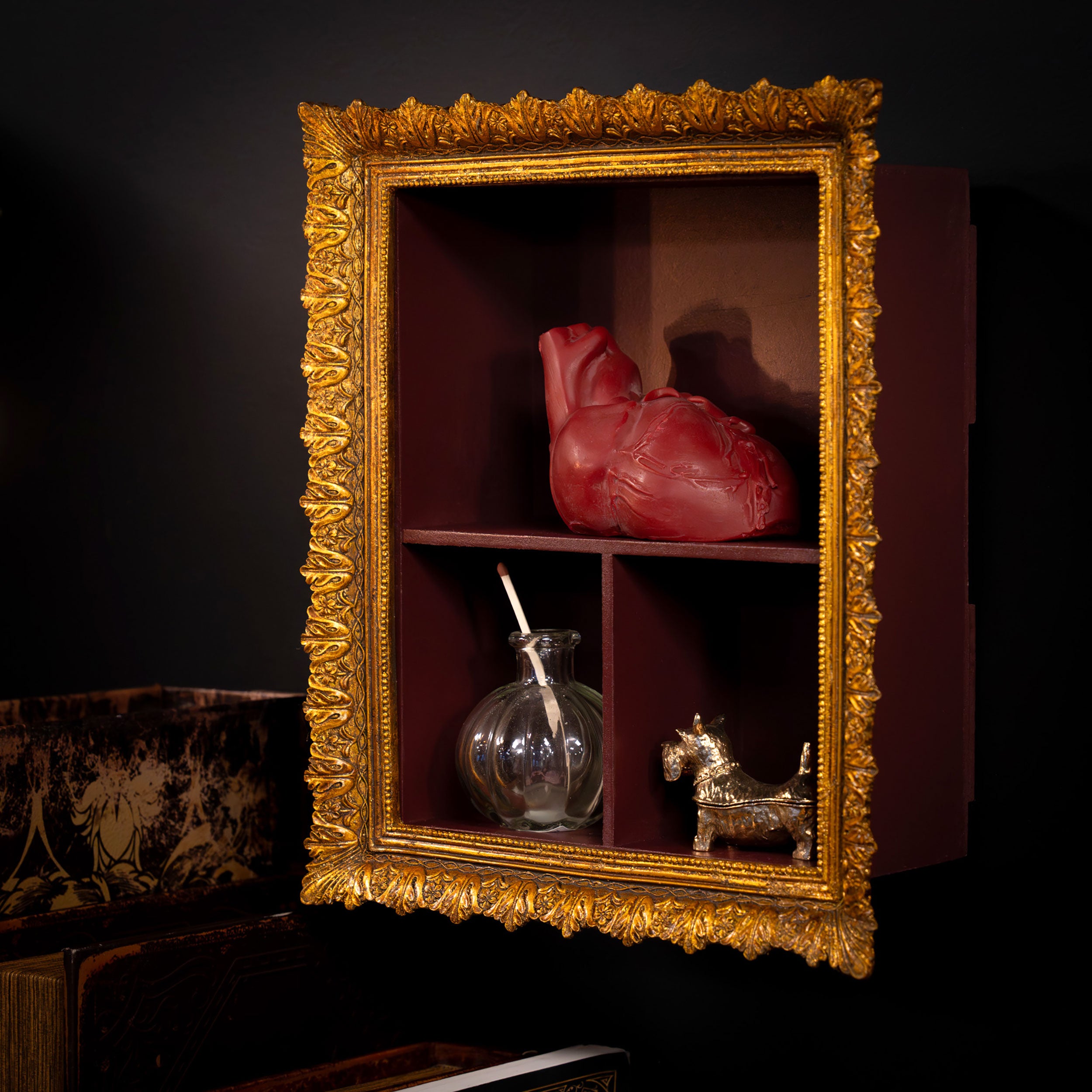 The ornate baroque shelf that is designed for all of the things small things we never quite know where to place. The interior is painted in a deep ox-blood red to perfectly showcase the trinkets that are placed inside.