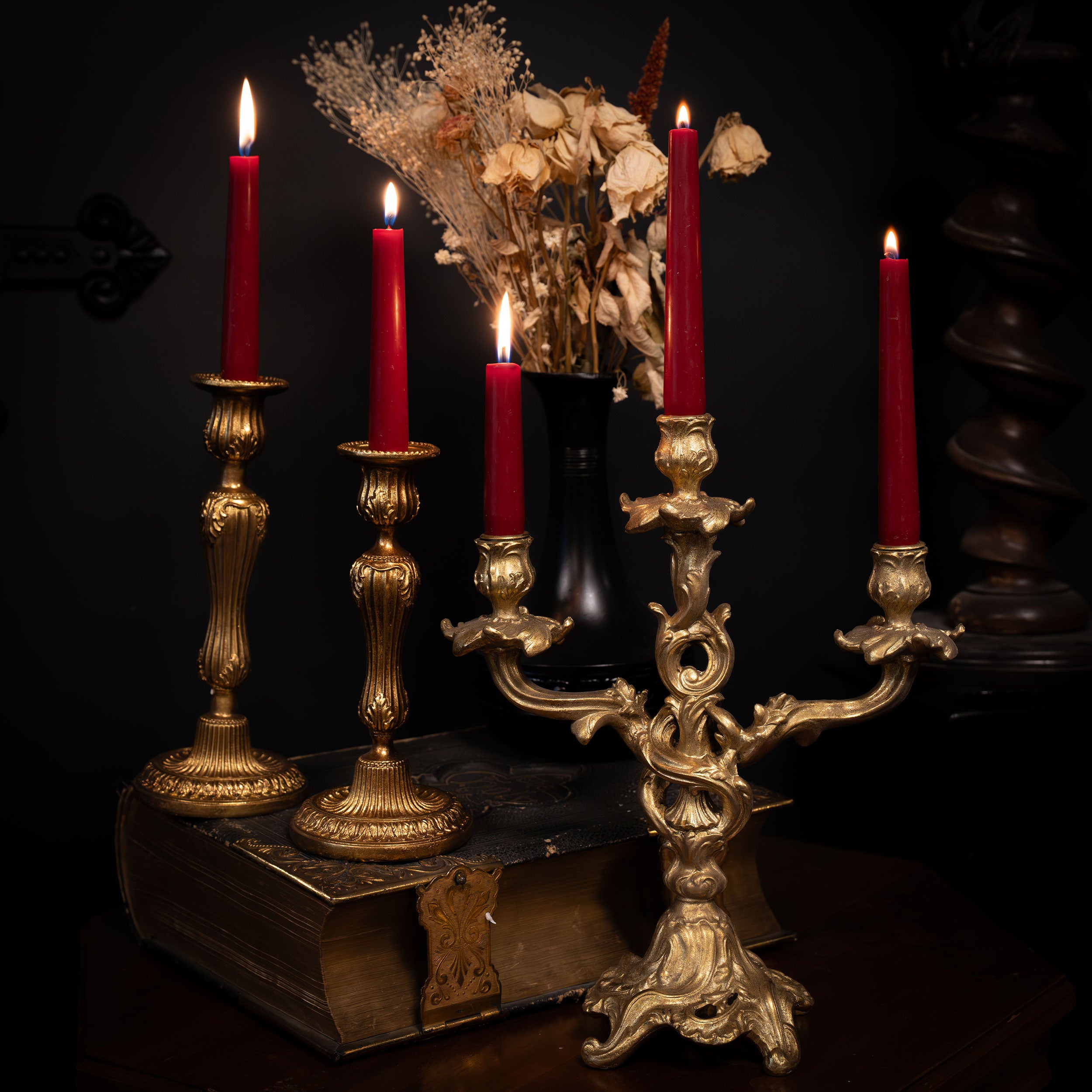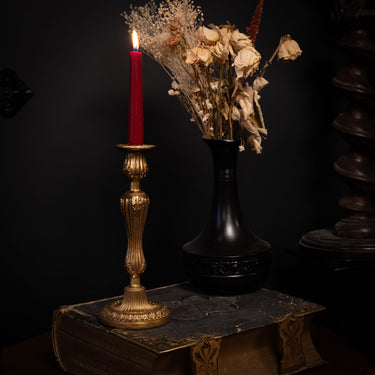 The Portia Gold Baroque Candlestick Holder is a study in quiet ornamentation. Finished in an antique gold tone, its sculpted form draws on Baroque detailing.