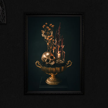 Gilded Vigil is a richly symbolic photographic print that captures the quiet tension between life's beauty and its inevitable decay. At its centre, a gleaming golden skull rests solemnly in a gilded urn partially filled with dark soil; an arresting juxtaposition of opulence and earth, permanence and return.