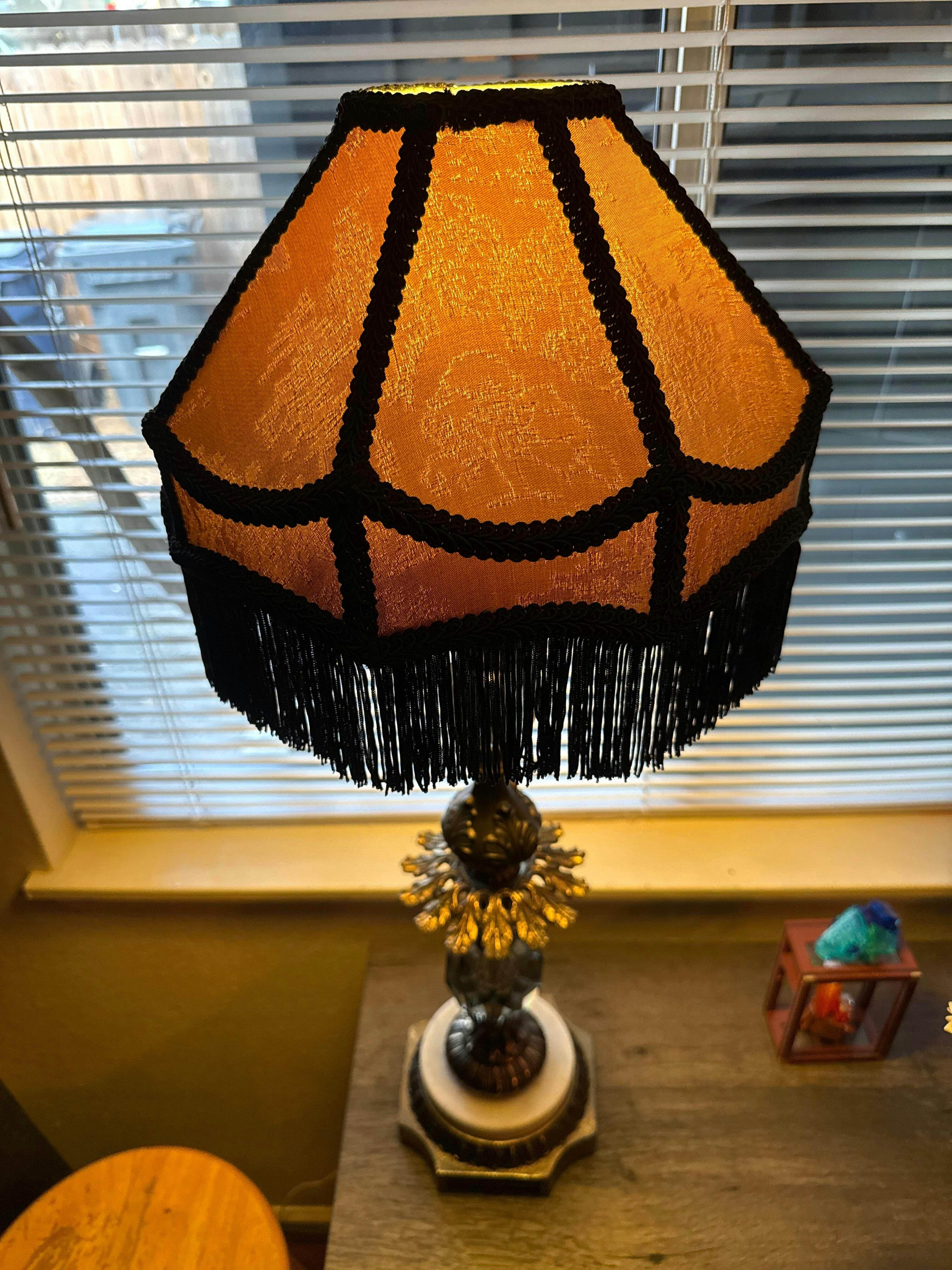 The Orla Baroque Lampshade. The lampshade can be used to adorn table lamps or ceiling lights. Perfect for adorning The Blackened Teeth table lamps, or your own table lamps. This lampshade can also be used as a ceiling lampshade (ensure you have a drop pendant from the ceiling to achieve these)