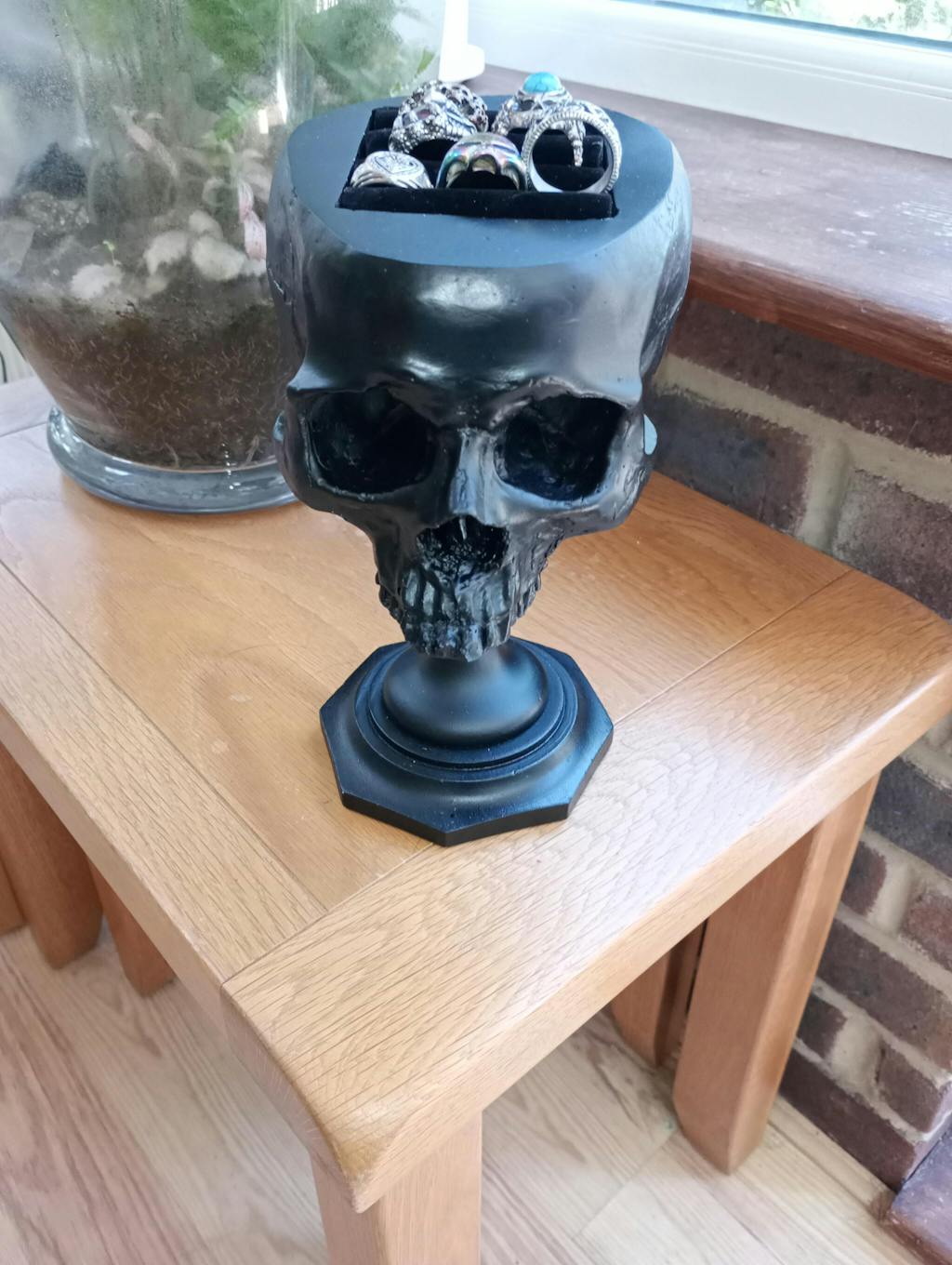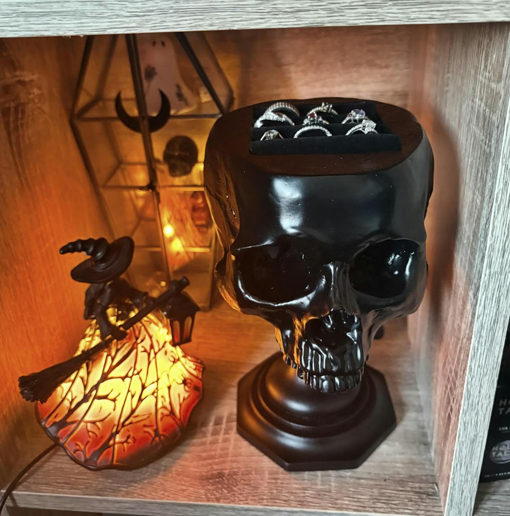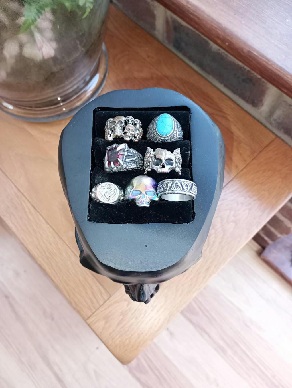 How else would you display a stunning ring collection; other than in the head of a (replica) human skull?