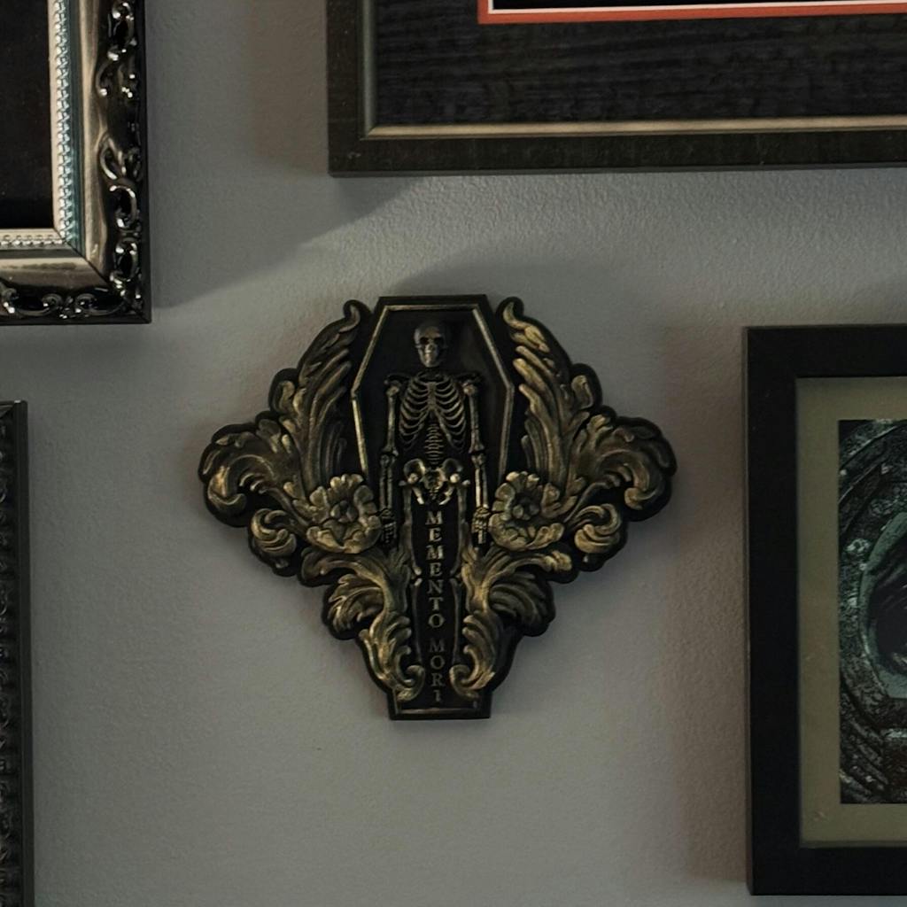 A striking wall hanging that merges macabre elegance with stoic symbolism. This handcrafted plaque features a solemn skeleton resting in a coffin, framed by intricate filigree details.