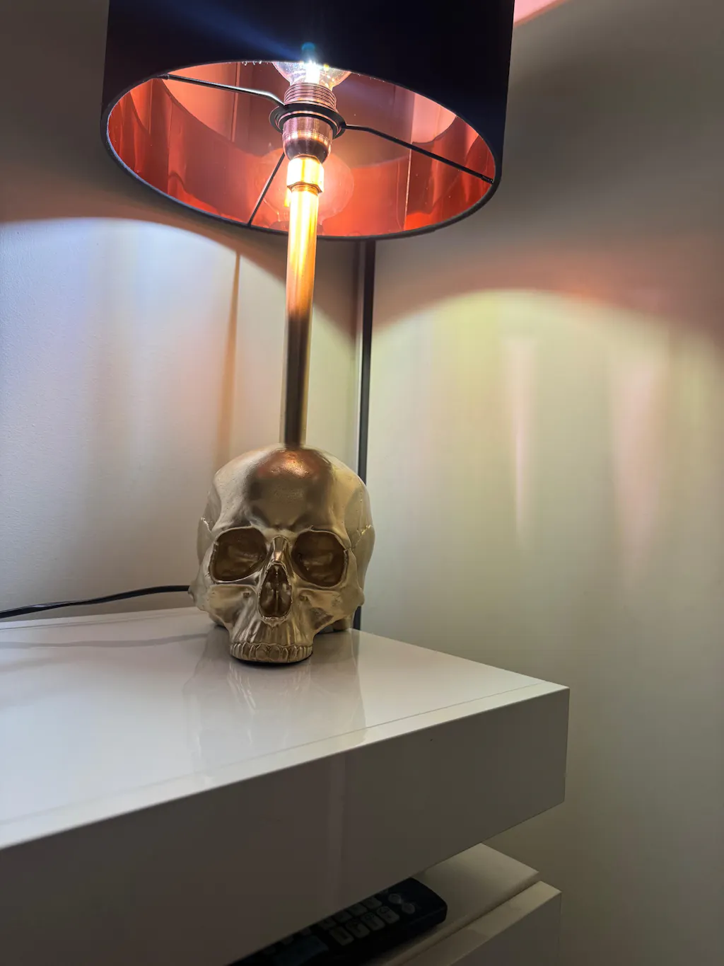 - Realistic size skull handcrafted from high quality plaster as a ready wired lamp, UK 3 pin plug.