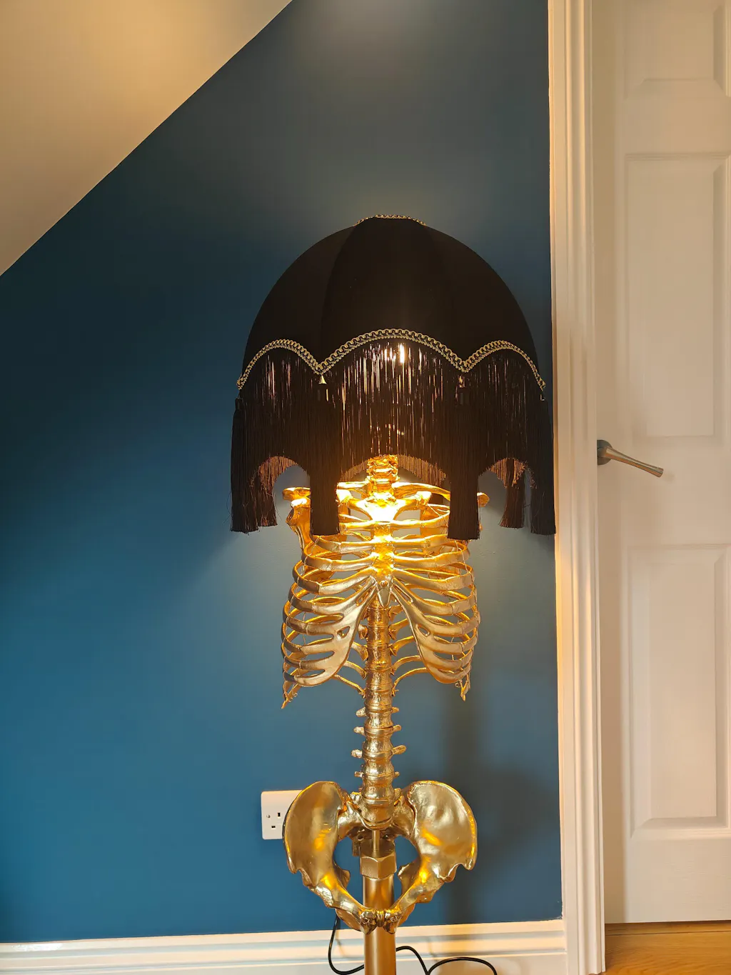 The Enid Baroque Edition is our iconic Skeleton Floor Lamp in Gold. The Enid Baroque Shade combines a classical style lampshade with a gothic aesthetic, adding a dark sophisticated touch to the floor lamp.