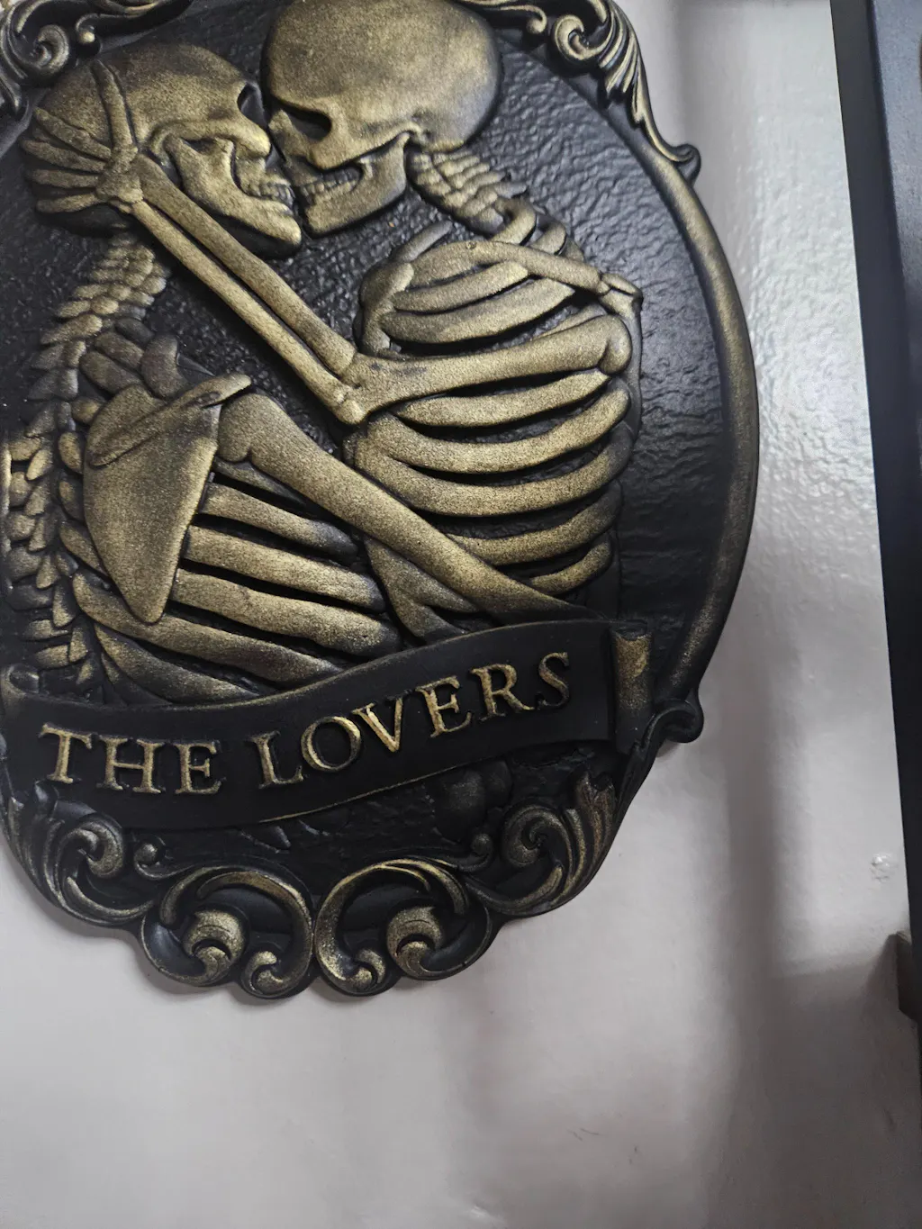 Crafted from black resin and accented with rich gold gilding, this oval wall decor features an intricately detailed depiction of two skeletons locked in an intimate kiss, symbolising timeless devotion beyond the grave.