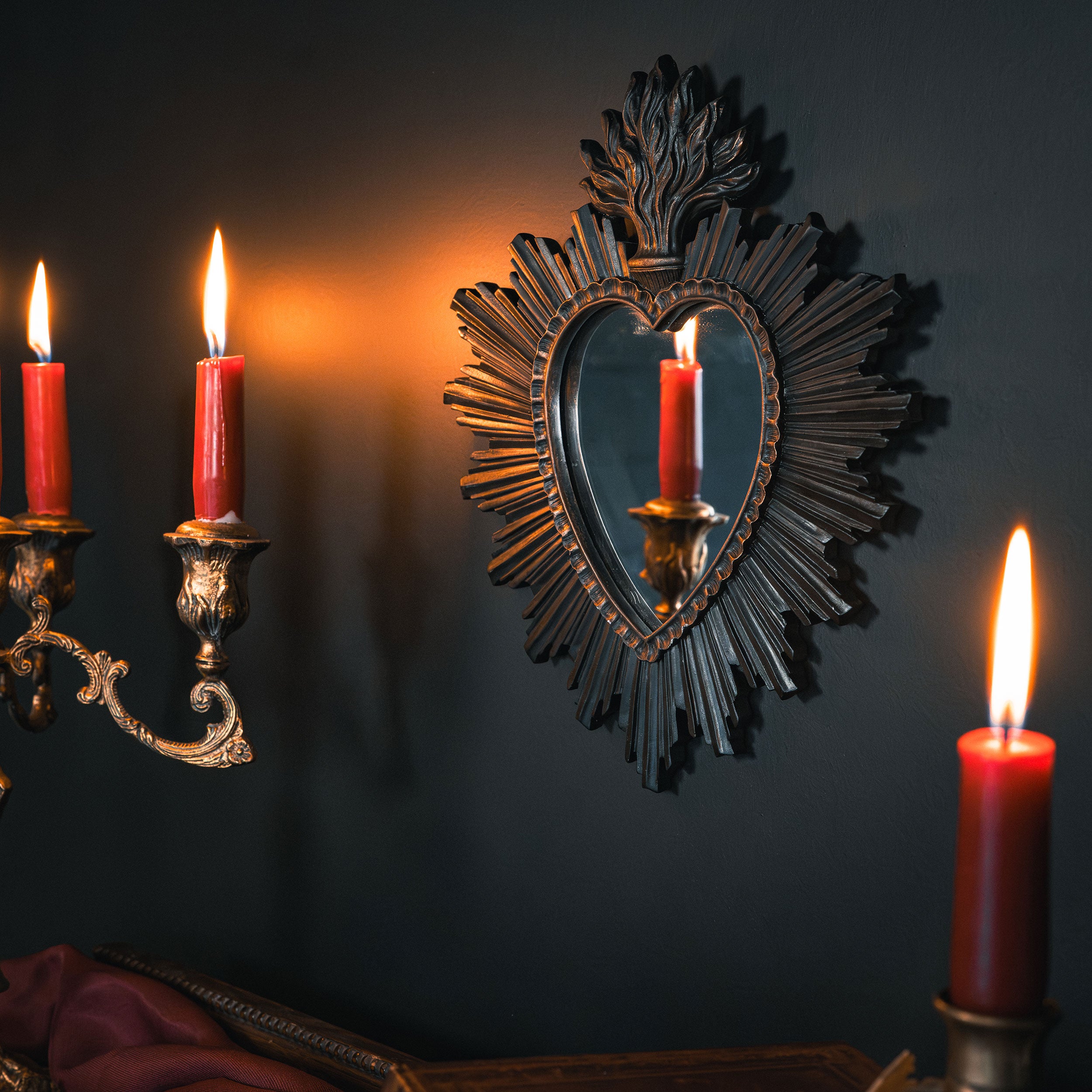 The Maude Sacred Heart Mirror is a radiant fusion of reflection and reverence. Inspired by devotional iconography, this gold mirror is framed by the iconic Sacred Heart; encircled in flames and crowned with a striking sunburst, symbolising divine light and enduring love.
