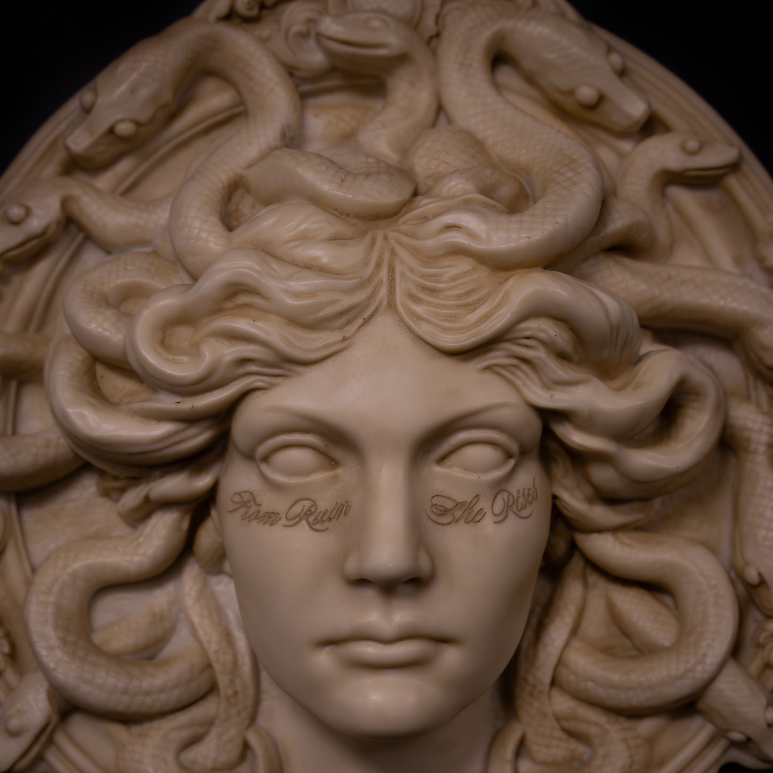 Serpents crown her head, while across her face an inscription reads: “From ruin, she rises.” A reminder that what was meant to destroy can instead become a source of power.