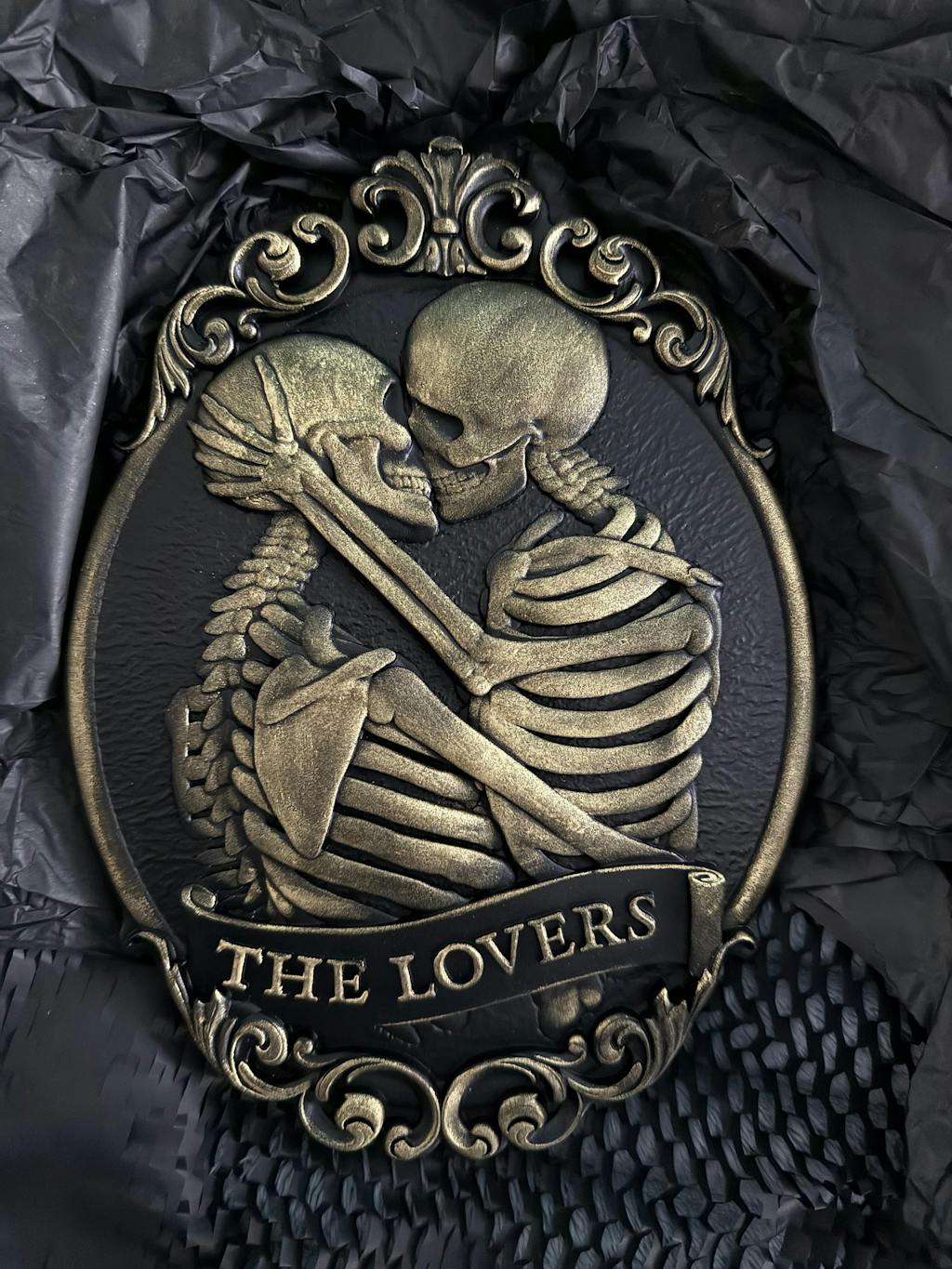 Crafted from black resin and accented with rich gold gilding, this oval wall decor features an intricately detailed depiction of two skeletons locked in an intimate kiss, symbolising timeless devotion beyond the grave.