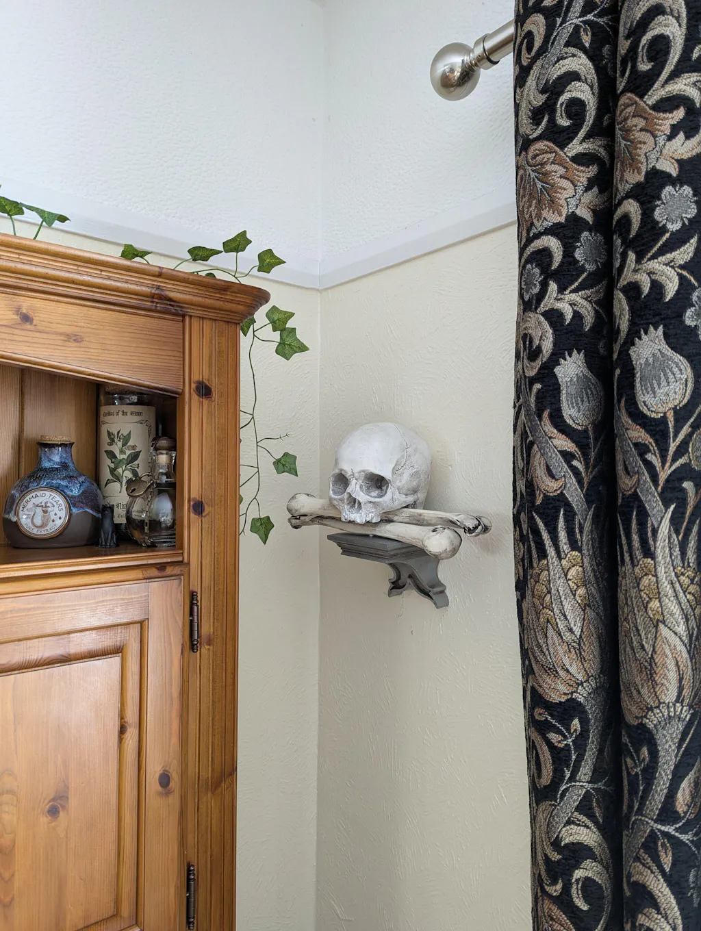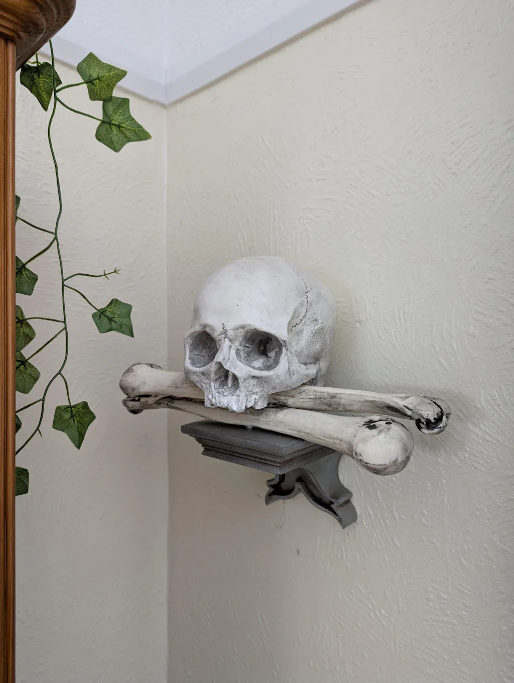 The Ossuary Skull Corbel is handmade by our Artisans and comprises of a replica human skull, 2 replica bones that sit upon an antiqued silver finish corbel.